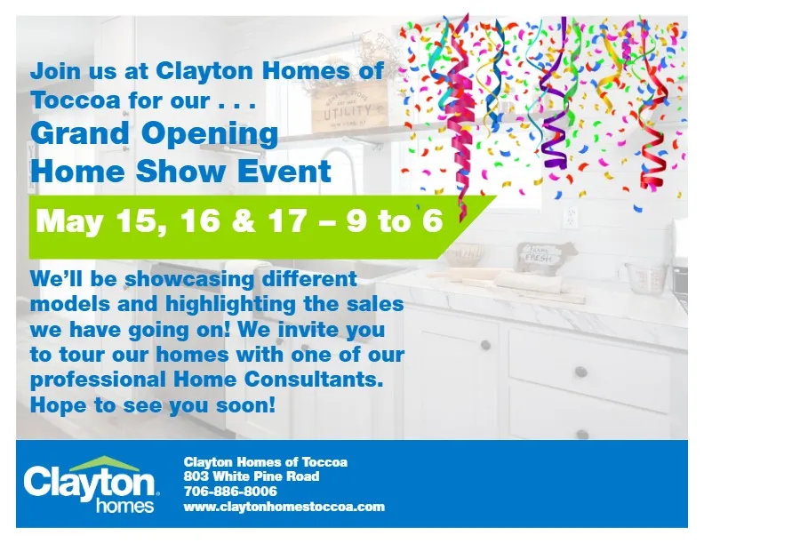 Clayton Homes of Toccoa is a leading provider of affordable, quality-built manufactured and modular homes in northeast Georgia. They offer a wide selection of customizable home options to meet various needs and budgets, along with expert guidance through the home buying process. Committed to customer satisfaction, Clayton Homes of Toccoa ensures each home is built with durable materials and energy-efficient features. The city of Toccoa, GA, nestled in the foothills of the Blue Ridge Mountains, is known for its rich history, outdoor recreation, and the scenic Toccoa Falls, a popular natural attraction.